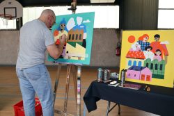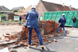 L’artiste Florimond Mochel a capturé ce moment en créant des peintures en « live », qui orneront les entrées des nouveaux immeubles. Aux côtés de William Picard, maire de Monswiller, et des équipes du promoteur, les collaborateurs de Vosgelis s’en sont ensuite donné à coeur joie pour abattre le dernier pan de mur de cette ancienne métallurgie.